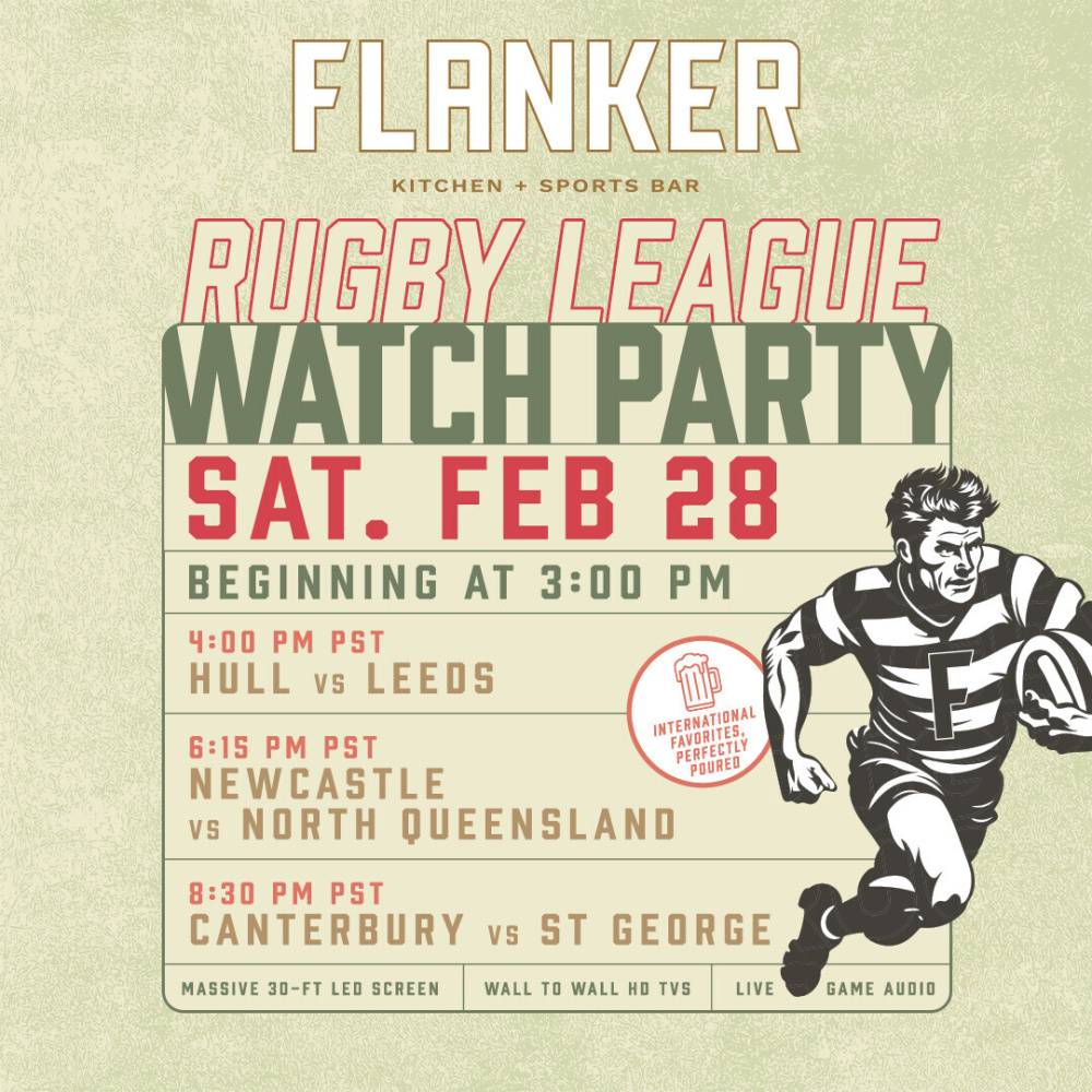 Join us at Flanker Kitchen + Sports Bar on Friday, February 28 as we bring the pitch to the Strip for a can't-miss Rugby Watch Party. Catch every hard hit, try, and late-night finish across our massive screens with full sound, ice-cold beers, game-day food specials, and an atmosphere built for big moments.